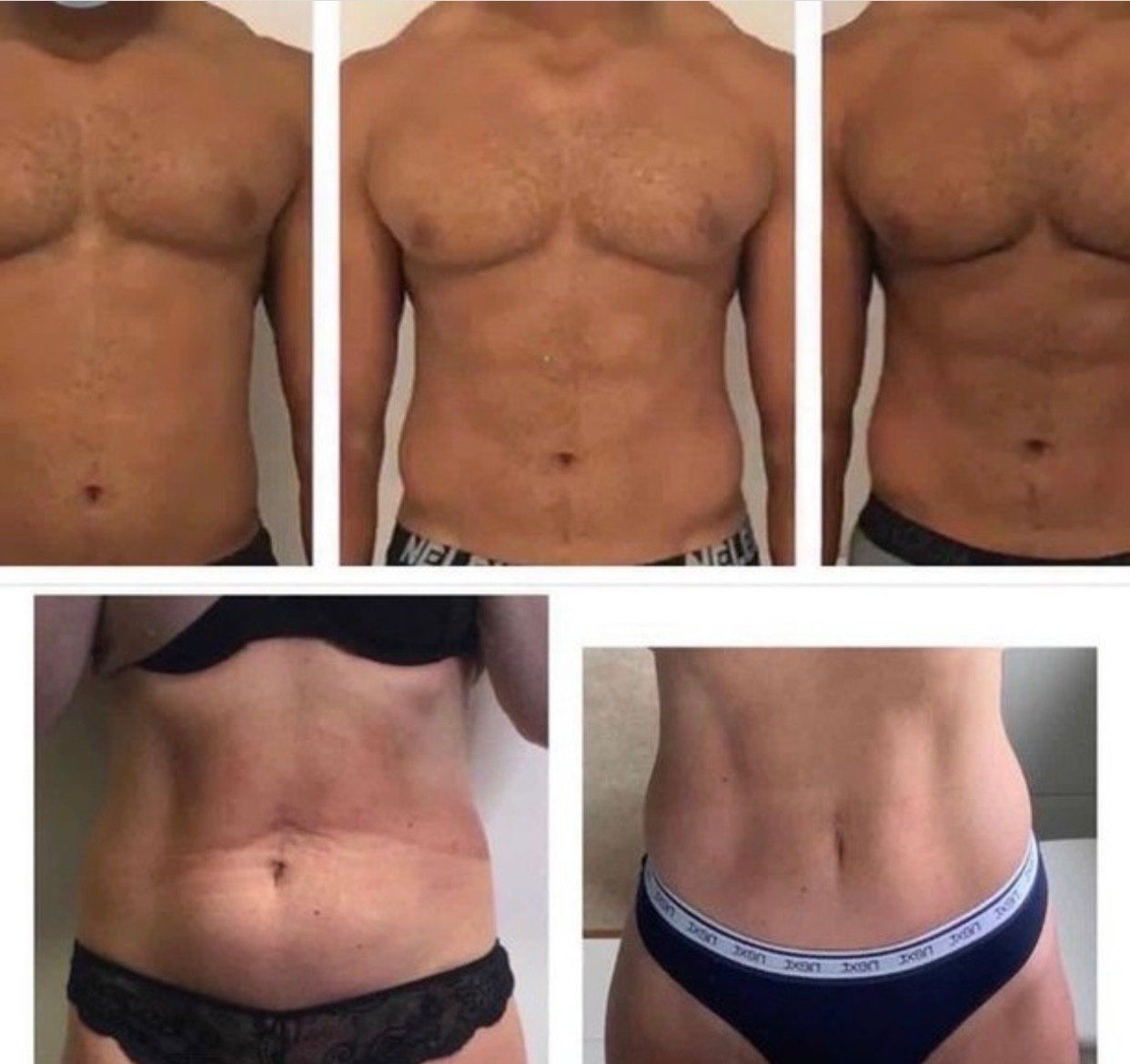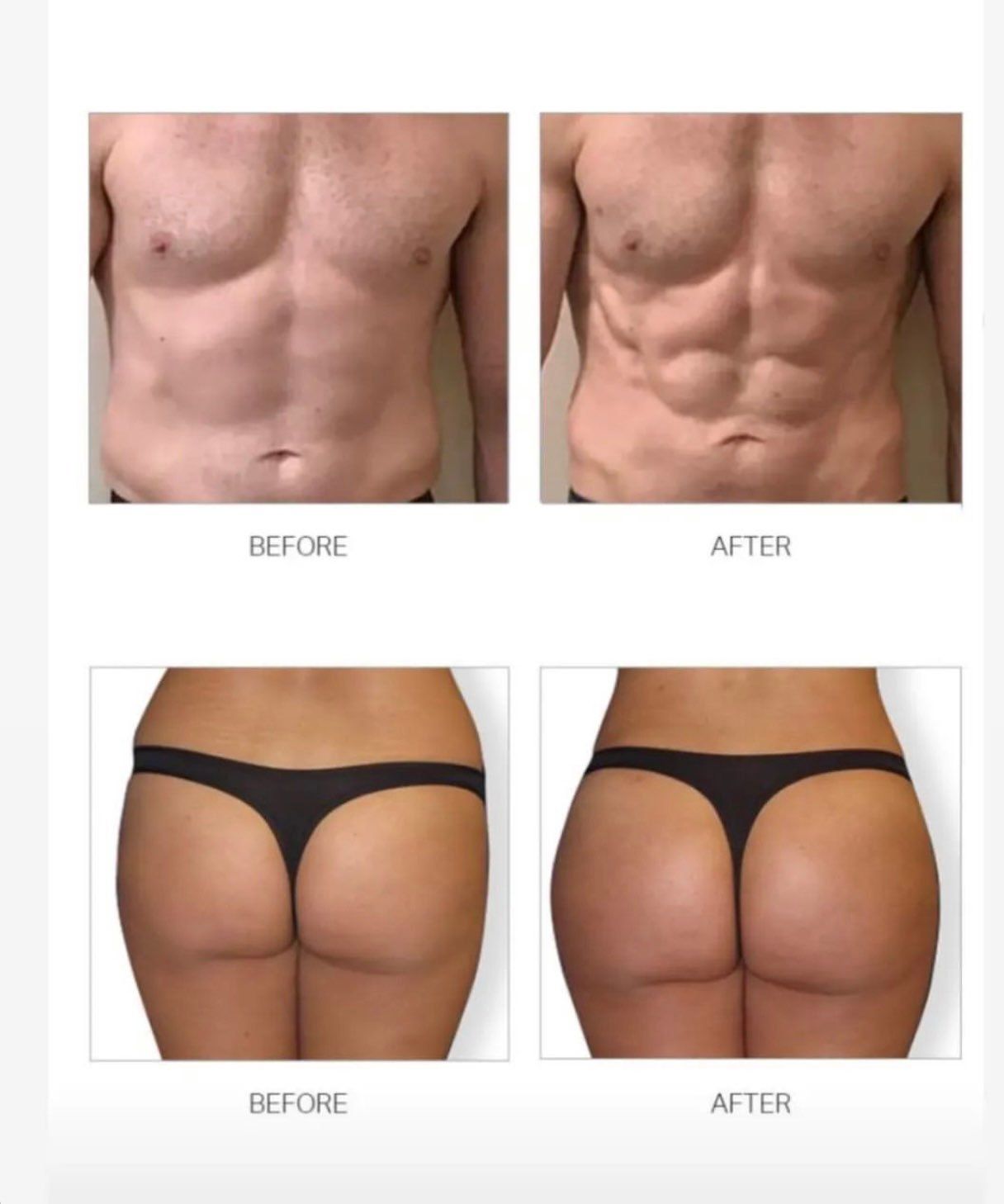 By the end of the treatment series the body will look slimmer, and more toned and beautiful. The muscles in the abdomen, legs and arms will be firmer and more visible, sagging buttocks will lift and localized fat will be reduced, achieving a fabulous body transformation without intense exercises or the risks associated with surgery.